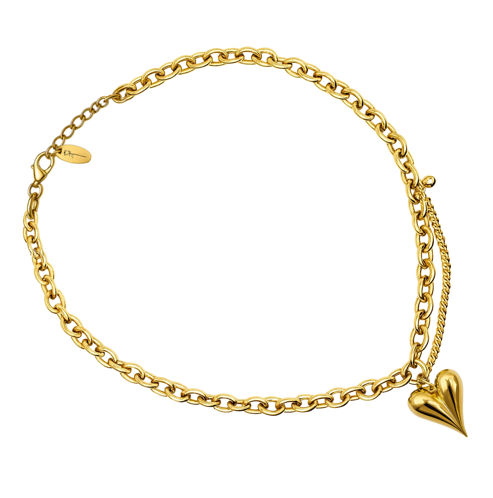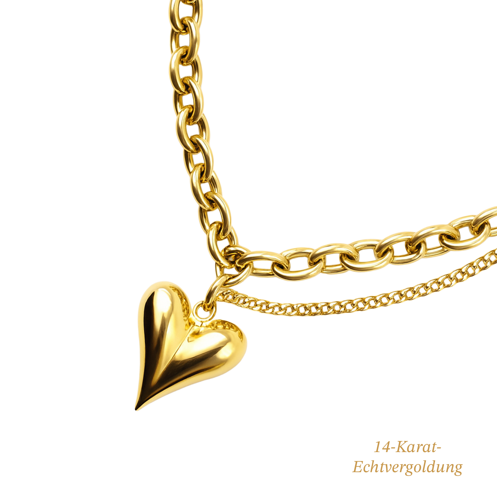 Diese außergewöhnliche Kette mit ihrem großen, glänzenden Herzanhänger ist ein Statement purer Emotion und Stil. Gefertigt aus hochwertigem Edelstahl und edel mit 14 Karat Gold vergoldet, vereint sie zeitlose Schönheit mit luxuriösem Glanz.