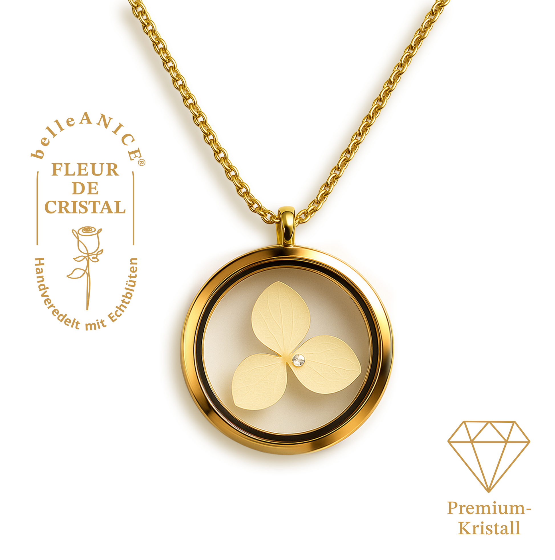 Jedes Medaillon ist ein Unikat und gefertigt mit echten, handverlesenen Blüten. Veredelt mit einem hochglänzenden, mehrfacettierten Premium Kristall für ein intensives Funkeln. Da jede Blüte auf natürliche Weise getrocknet wurde, kann ihre Form oder Lage leicht variieren. Diese feinen Unterschiede machen jedes Stück einzigartig – so individuell wie die Natur selbst.